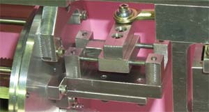 回転運動を往復運動に変換する機構には,スコッチ・ヨーク機構を採用しました。右図に示すスコッチ・ヨーク機構は,クランクディスクの偏心させた位置に回転軸を取り付け,長穴をあけたヨークを往復運動させます。往復運動のストロークはクランク半径を変更することで調整できます。UPF-2001では,ストロークを16 mmとしています。ヨークに直動玉軸受を取り付けていますので,シール機構に無理な力がかかりにくい,理想的な直線運動を実現しています。