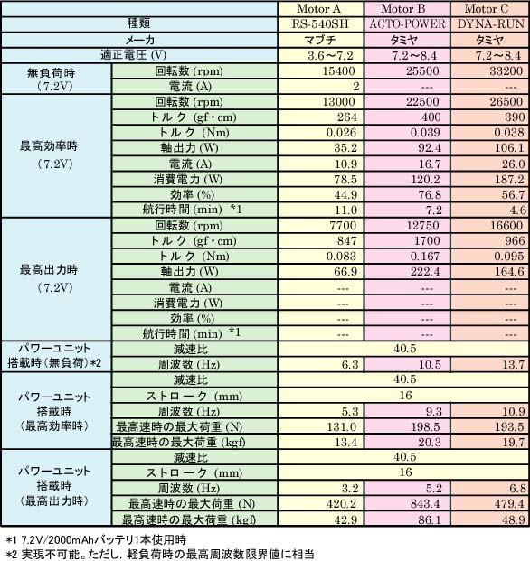 UPF-2001の動力源には市販のラジコン模型用直流モータを使用しています。直流モータは,R/Cサーボモータやパルスモータと比べて,小型・高出力で扱いやすいという特徴があります。また,様々な出力レベルの直流モータが市販されているので,出力や周波数の点で問題になることはほとんどありません。しかし,後述するような,回転運動を減速する機構や往復運動に変換する機構が必要になります。なお,UPF-2001のパワーユニットでは,異なる特性を持つ3種類の直流モータを準備しています(表1,表2参照)。