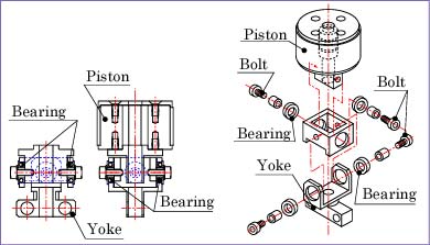 右図は,実験用スターリングエンジンのピストン部分を説明するための図面である。この例の場合,組み立てられたピストンを第三角法による二面図で表し,組立方法(部品の構成)を説明する図面を部品ごとの立体図で表している。