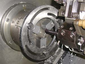一方,NC旋盤では生爪(なまづめ)と呼ばれる油圧チャックを使います。新しい生爪は,そのままでは材料をしっかりとチャックすることができません。使用する前には,材料の形状(外径または内径)に合わせて削っておく必要があります。