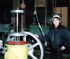 このスターリングエンジンはα形で、2つのパワーピストンを垂直に対抗させて配置したエンジンです。この形式ではピストン、熱交換器など各要素間の距離が最短となり、死容積や作動ガスの流動抵抗を小さくすることができます。当研究室の最も新しい実験用スターリングエンジンです。