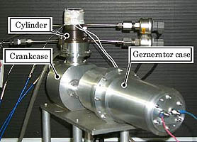 The figure to the right shows the developed hermetic generator set. The electric generator shown in the figure has big size, because it needed enough capacity for the experiments at wide-range speed condition. It can realize a more compact size generator set, if the engine works only at rated operation in practical use.