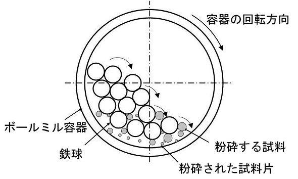 ボールミルは、円筒形の容器(ミルポット)に粉砕する対象物(本研究の場合は鉱石)と粉砕媒体(鉄球等)を封入し、ミルポットを回転させることにより、鉄球との衝突や摩擦によって鉱石を粉砕します(図4参照)。構造が単純で故障しにくいことから、海底選鉱システムの粉砕ユニットの候補として研究することになりました。