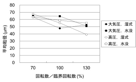 試験では、水没粉砕と湿式粉砕を大気圧条件と高圧条件の両方で行いました。実験のパラメータとして、ミルポットの回転数を変え、臨界回転数※4を基準とした場合の70%、100%、130%の3条件で試験を行いました。