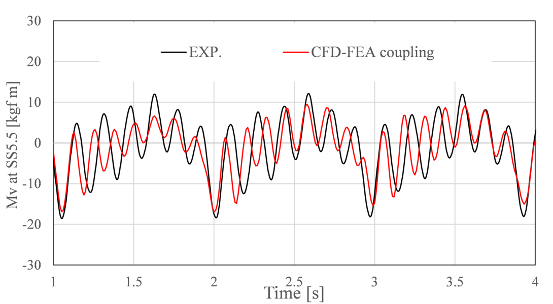 Figure 1 compares the impact load predicted by CFD with the experimental value for the evaluation points on the bow. We can see that the peak water pressure due to impact can be accurately estimated. In addition, by combining CFD and FEM, it is possible to predict the elastic vibration (whipping) of the hull due to slamming. Figure 2 compares the experimental value of the vertical bending moment in the center section of the hull. By applying this research, it is possible to estimate the impact load on the upper structure due to seawater injection and on the stern part, to evaluate the final hull strength more rigorously, to predict the wet deck slamming of catamarans, and to achieve innovative contribution to the ship hull design.