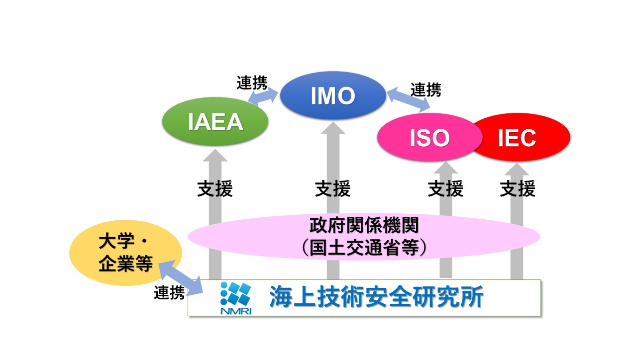 海技研は、これらの国際機関への我が国政府の取り組みに対して、技術的な裏付けのための調査・研究の実施や資料の作成、国際会議への専門家の派遣および議長などの役割の実行、関連する国際会議の誘致・開催など、積極的に貢献しています。