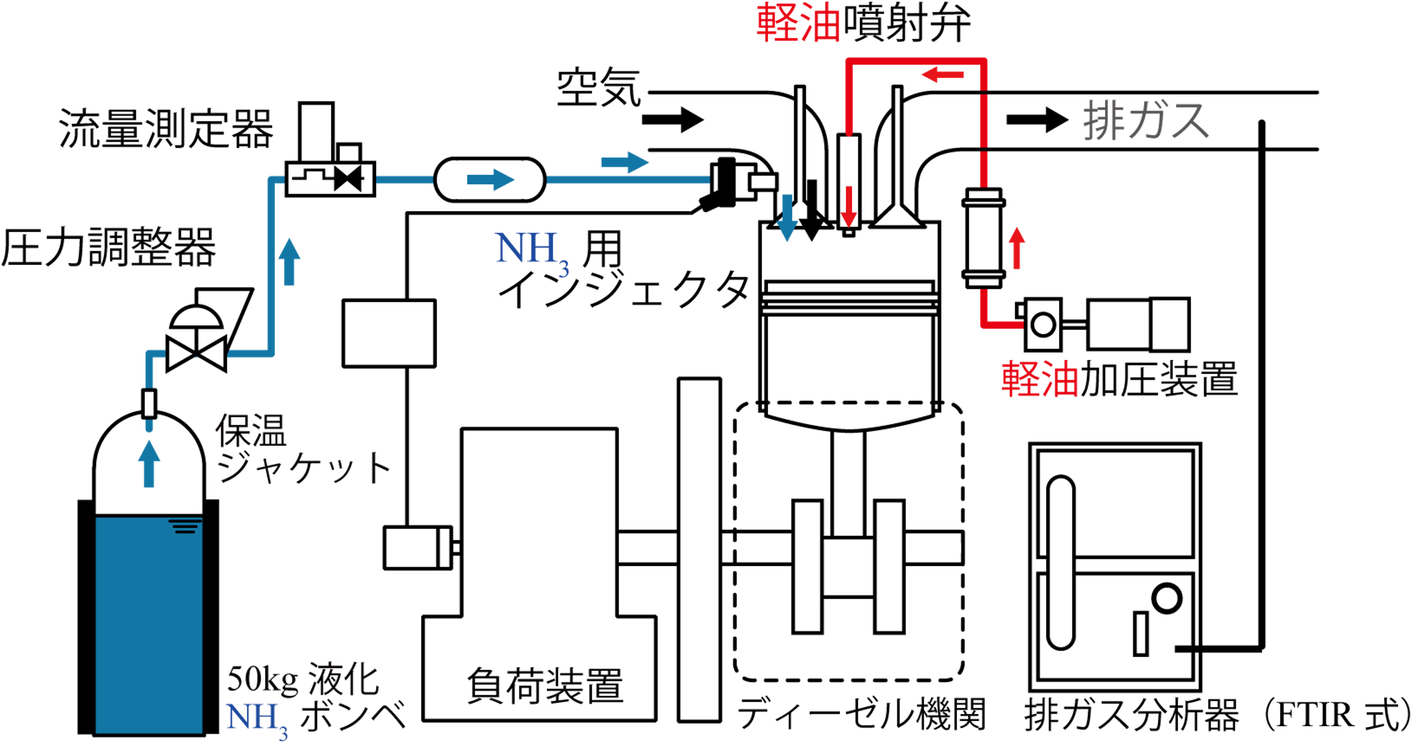 アンモニア(NH3)は、水素と同様に炭素を含まないので燃焼してもCO2を発生しない燃料です。水素に比べて容易に液化することができ、単位体積当たりの発熱量は、液化水素の約1.6倍と、燃料として積載性が優れています。この様な観点から、船舶の代替燃料として注目が集まっています。動力システムグループでは、ディーゼルエンジンを利用してアンモニアと軽油を混焼させることでアンモニアを燃焼させて、アンモニア燃料利用のための基礎的な実験を実施してきました。実験では、アンモニアが未燃のまま排出されることや温室効果ガスである亜酸化窒素(N2O)が排出されることを明らかにし、それらの低減方法を研究開発してきました。